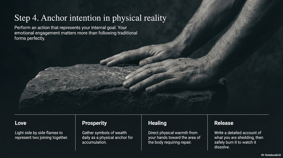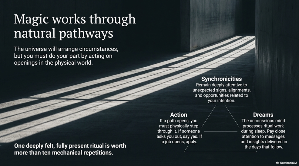 The power of the ritual doesn't come from the ritual itself but from what you bring to it. A ritual performed mechanically, without genuine feeling and focused intention, accomplishes little. But a ritual performed with full presence, emotional engagement, and cultivated energy can create remarkable shifts.