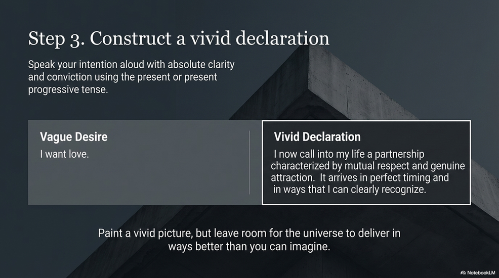 This is where you declare exactly what you're working to manifest. Speak it aloud with absolute clarity and conviction.