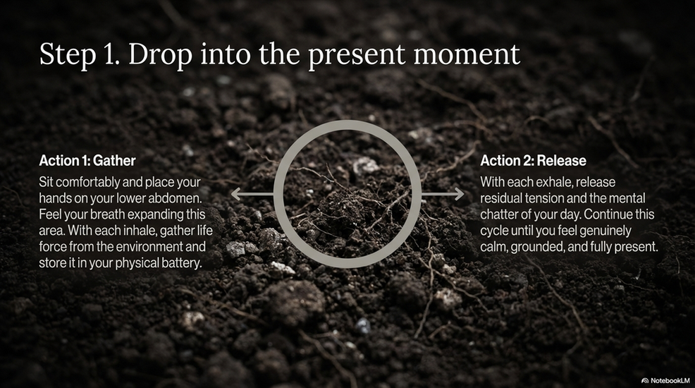 Place your hands on your lower abdomen (Lower Dantian) and feel your breath expanding this area. With each inhale, imagine you're gathering Qi from the environment and storing it in your energetic battery. With each exhale, release any residual tension or distraction. Continue until you feel genuinely calm, grounded, and present.