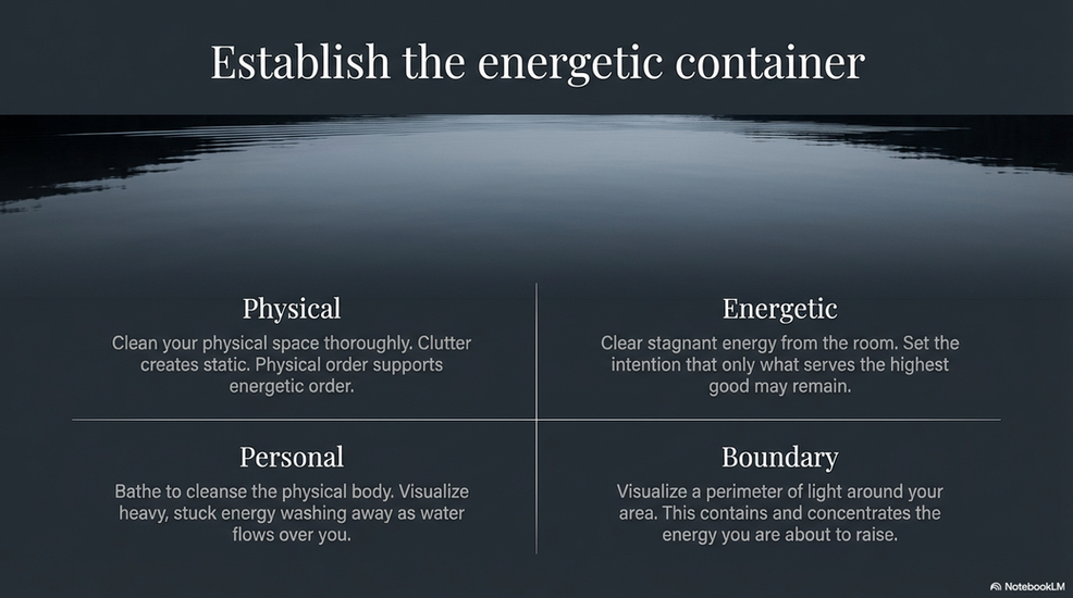 Before beginning any ritual, you must create a clear energetic container. This serves multiple functions: it separates ritual time from ordinary time, it protects you from unwanted influences while you're in an open, receptive state, and it signals to your unconscious mind that something significant is about to occur.