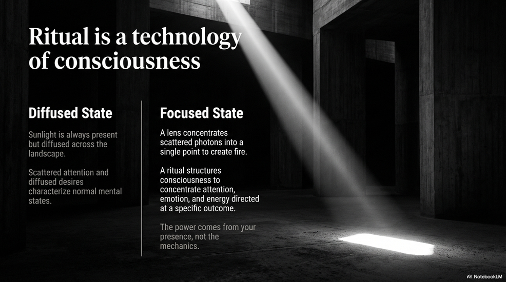 Think of ritual as a lens that focuses sunlight. Sunlight is always present, diffused across the landscape. But when you focus it through a lens, concentrating all those scattered photons into a single point, you create enough heat to start a fire. Ritual does the same thing with consciousness and energy. It takes the scattered attention and diffused desires that characterize your normal mental state and concentrates them into a focused beam directed at a specific outcome.