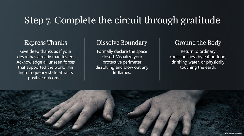 Then, formally close your ritual space: "I now close this sacred space. I give thanks to all beings and forces who have assisted. This ritual is complete. Blessed be." Visualize your protective boundary dissolving or opening. Blow out any candles you've lit. Ground yourself by eating something, drinking water, or touching the earth.